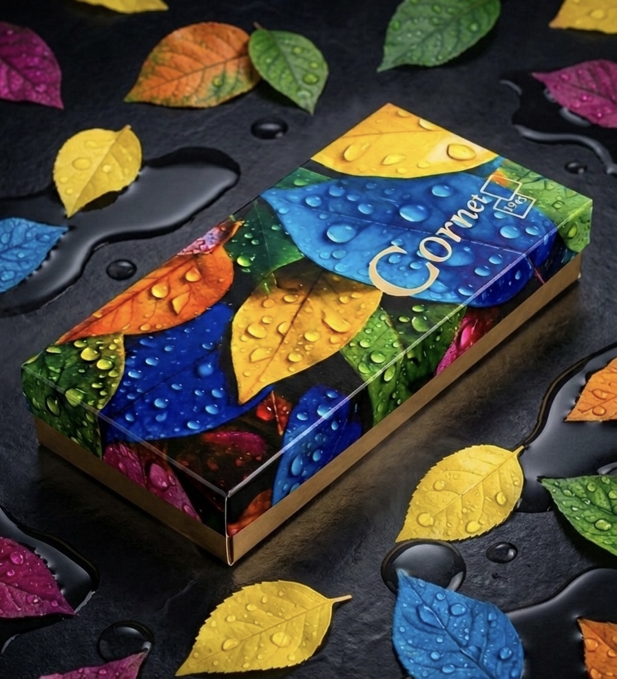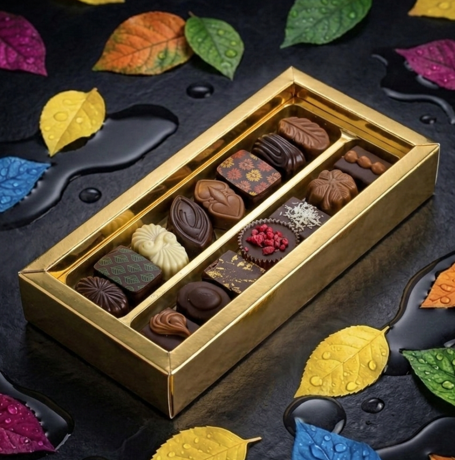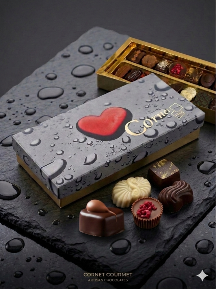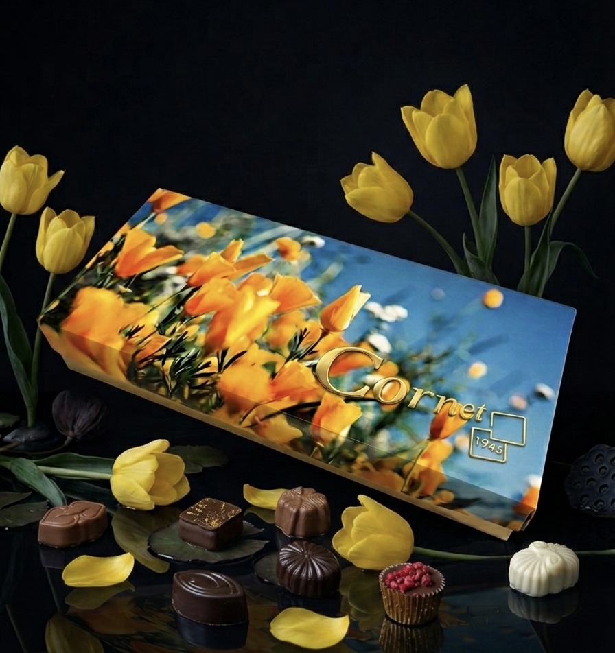 En su interior, 16 bombones artesanales de la colección Cornet 1945 revelan una selección exquisita elaborada a mano, donde tradición chocolatera y creatividad se encuentran en cada detalle. Rellenos delicados, texturas sorprendentes y sabores cuidadosamente equilibrados convierten cada bombón en una pequeña obra de arte.